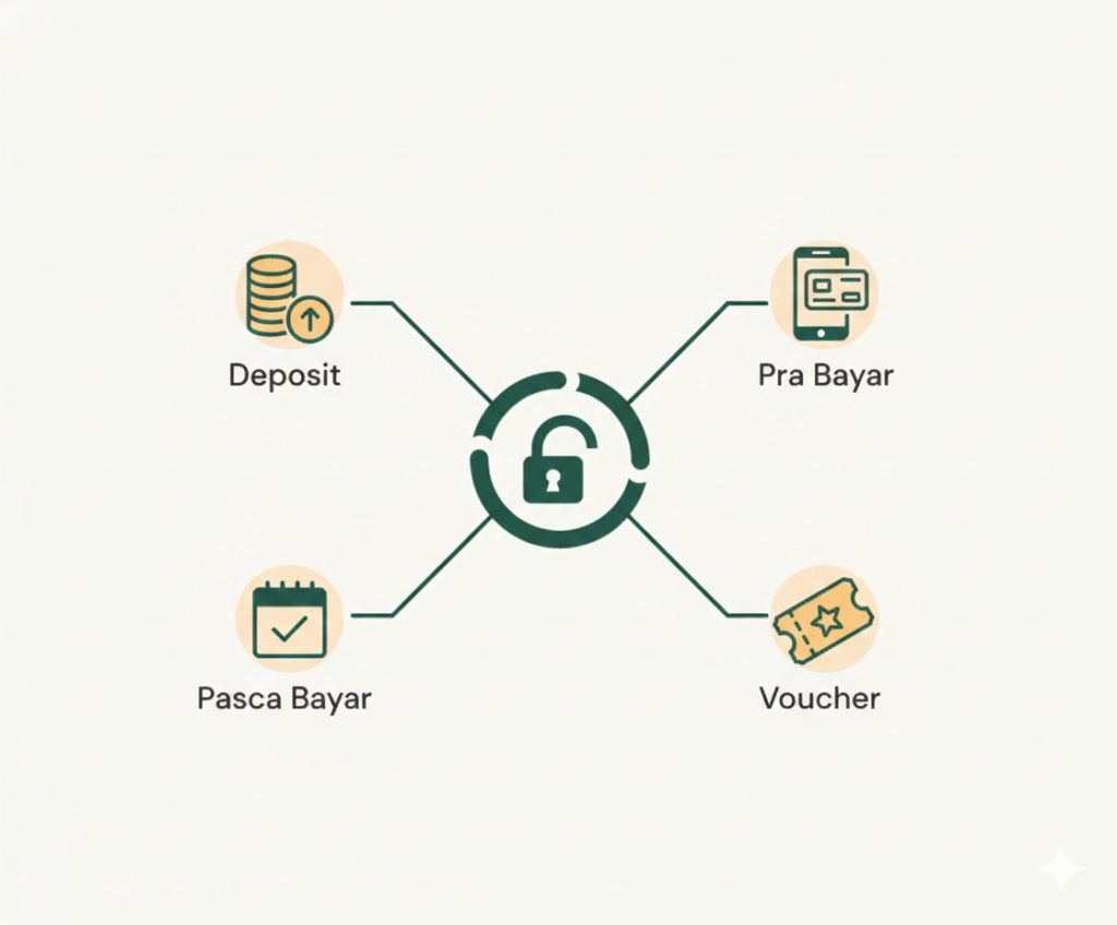TELMOB mendukung deposit, prabayar, pascabayar, dan voucher sesuai kebijakan lembaga pengelola.